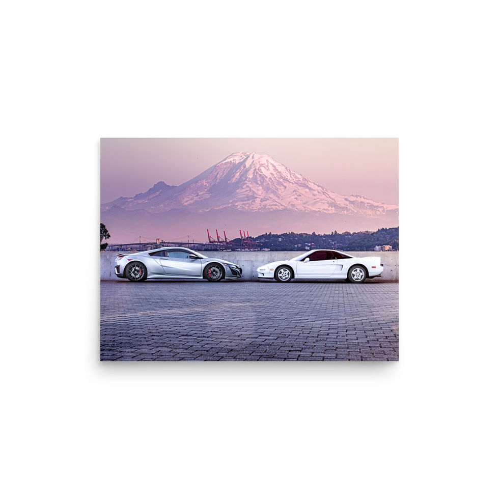 NSX Generations Against Mount Rainier Matte Poster Wall Art Garage Mancave Dorm
